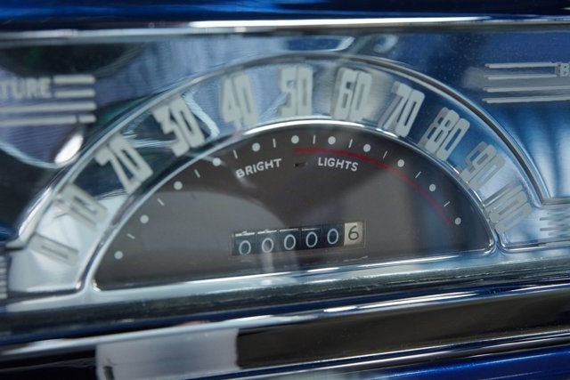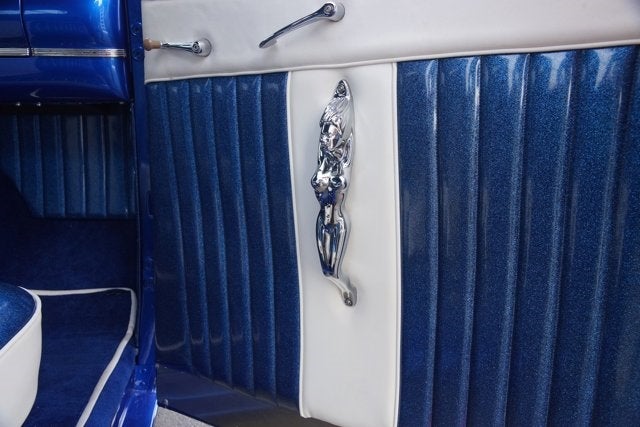 The bodywork boasts custom bright blue metal flake paint with hand-done flames and pinstriping, shaved handles, mirrors and bumpers, and it features a custom nose with open engine bay, which is fully matched to the rest of the truck right down to the pinstriped Cadillac air cleaner and color-matched engine block. The customized bed houses a stainless fuel tank and sits on a bespoke, box section rear frame. The front end received the classic hot rod treatment with dropped spindles, disc brakes, and inverted leaf spring, while the rear suspension is upgraded with coil springs and adjustable air shocks.